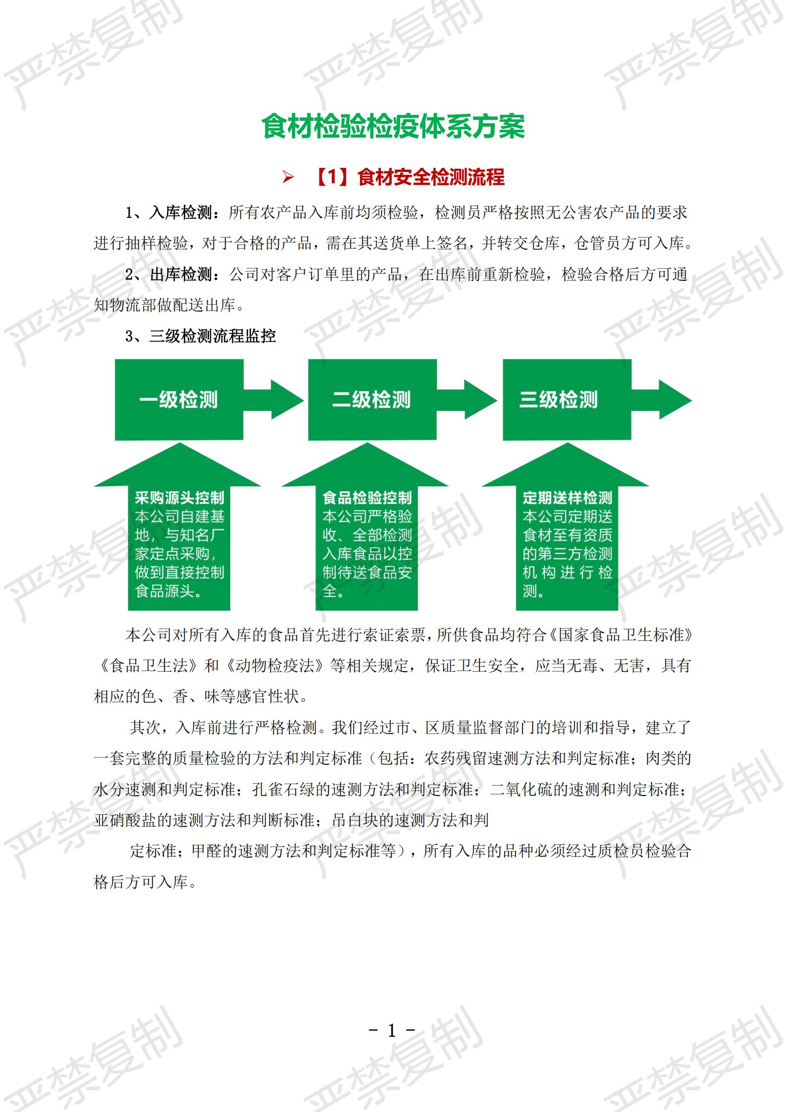【1】食材安全检测流程:1、入库检测,2、出库检测,3、三级检测流程监控;【2】食品检测监管方案